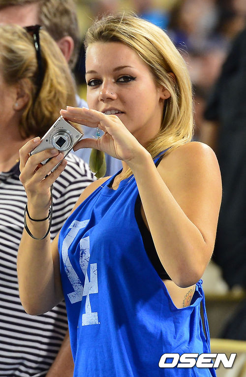 15일 (이하 한국시간) 미국 캘리포니아주 로스앤젤레스 다저스타디움에서 열린 2013 메이저리그 LA 다저스와 샌프란시스코 자이언츠의 경기, 다저스 미녀 팬이 선수들의 사진을 찍고 있다.