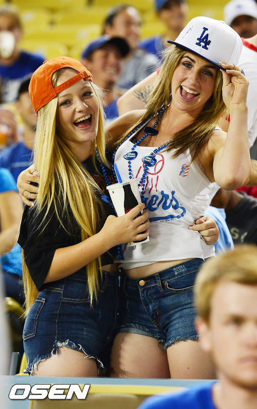 15일 (이하 한국시간) 미국 캘리포니아주 로스앤젤레스 다저스타디움에서 열린 2013 메이저리그 LA 다저스와 샌프란시스코 자이언츠의 경기, 다저스 미녀팬과 샌프란시스코 미녀팬이 포즈를 취하고 있다.