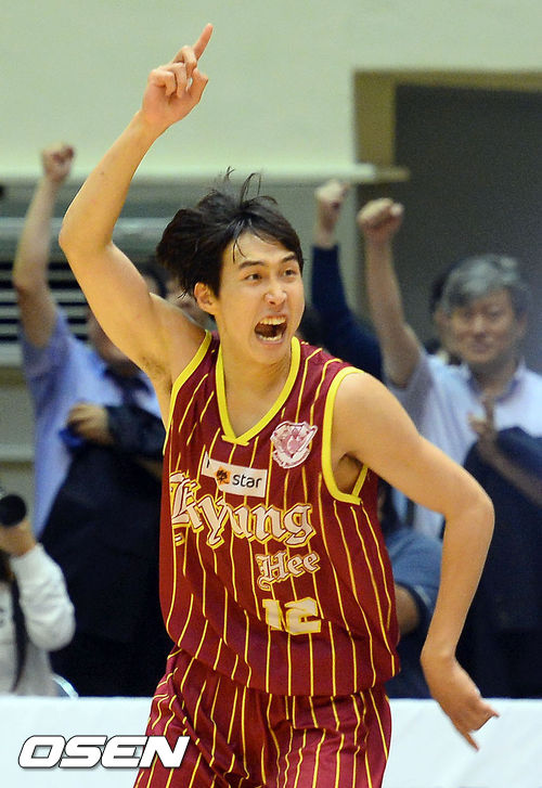 15일 오후 경기도 수원대학교 체육관에서 열린 2013KB국민은행 대학농구리그 경희대와 고려대의 챔피언결정전 3차전, 3쿼터 앞서나가는 점수차에 경희대 김영현이 기뻐하고 있다.