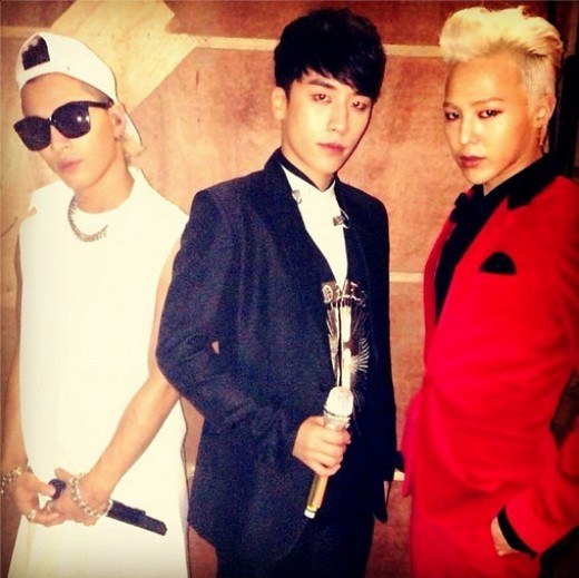 승리는 15일 인스타그램을 통해 "KOREA SBS '인기가요(inkigayo)' '렛츠 토크 어바웃 러브(Let's talk about Love)' Live with 지드래곤, 태양"이라는 글과 지드래곤과 태양과 함께 한 인증샷을 게재했다.