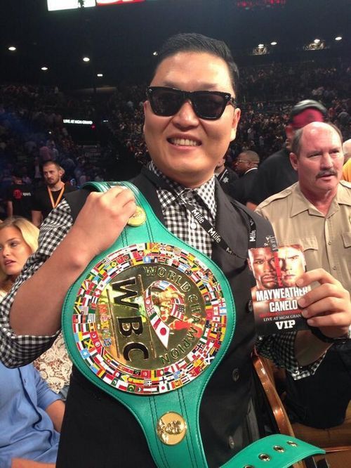 싸이는 15일(한국시간) 자신의 트위터를 통해 ‘WBC 웰터웨이트 챔피언 벨트를 걸치고’(with the WBC Welterweight championship belt)라는 글과 함께 한 장의 사진을 공개했다. 한 손에는 경기 VIP 티켓을 손에 들고복싱 챔피언 벨트를 어깨에 걸친 채 활짝 웃고 있다.