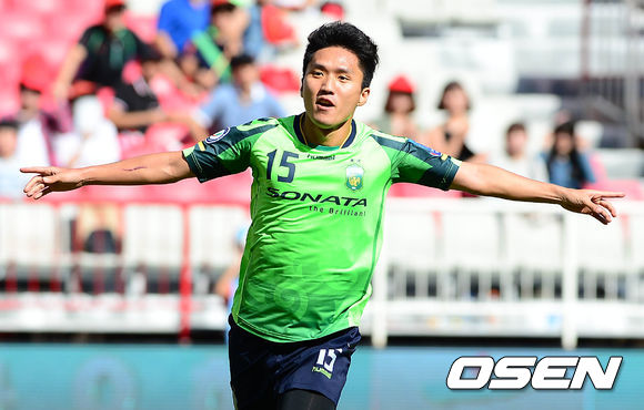 15일 오후 부산 아시아드주경기장에서 열린 하나은행 FA컵 준결승전 부산 아이파크와 전북 현대의 경기, 전반 전북 정혁이 선제골을 성공시키고 환호하고 있다.