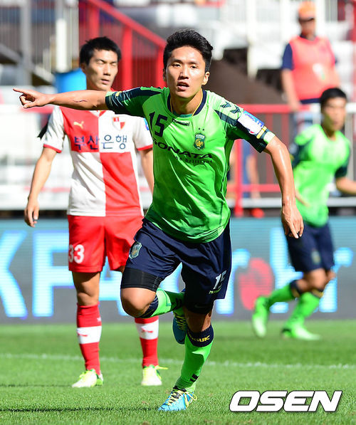 15일 오후 부산 아시아드주경기장에서 열린 하나은행 FA컵 준결승전 부산 아이파크와 전북 현대의 경기, 전반 전북 정혁이 선제골을 성공시키고 환호하고 있다.