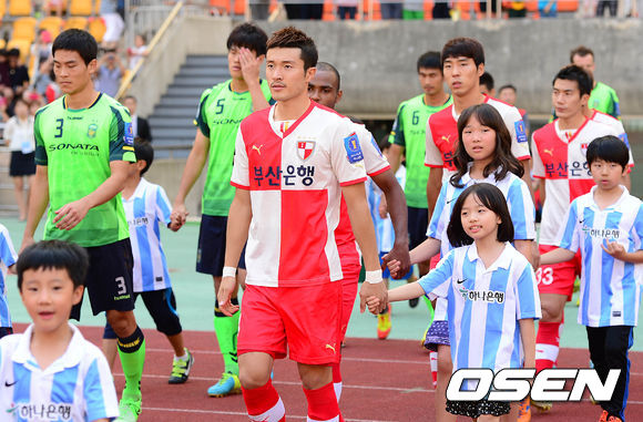 15일 오후 부산 아시아드주경기장에서 열린 하나은행 FA컵 준결승전 부산 아이파크와 전북 현대의 경기, 경기에 앞서 양팀 선수들이 그라운드로 가고 있다.
