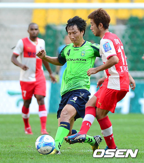 15일 오후 부산 아시아드주경기장에서 열린 하나은행 FA컵 준결승전 부산 아이파크와 전북 현대의 경기, 전반 전북 김상식이 부산 김익현을 수비하고 있다.