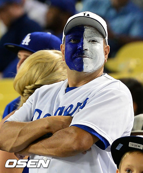 다저스 팬이 얼굴에 페이팅을 한채 응원을 하고 있다. / rumi@osen.co.kr