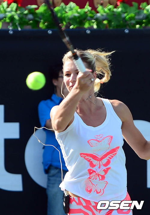 마리아 키릴렌코가 15일 오후 서울 방이동 올림픽공원 테니스 센터 코트에서 열린 원포인트 레슨에 참석해 시범을 보이고 있다.