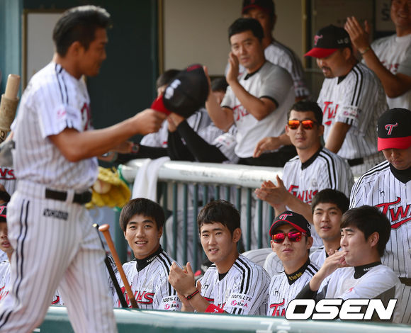 15일 오후 서울 잠실구장에서 열린 '2013 한국야쿠르트 세븐 프로야구' LG 트윈스와 NC 다이노스의 경기 시작전 시구를 마친 추성훈에게 LG 선수들이 박수를 보내고 있다.
