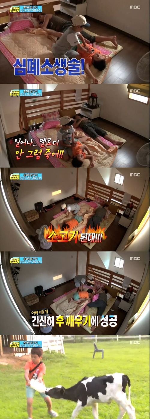 민국이는 마치 '심폐소생술'을 하듯 윤후의 가슴을 누르는가 하면, 계속 그를 불렀다. 그러나 윤후를 깨운 것은 아빠의 한 마디였다. 윤후가 맡은 멜로디를 언급하며 "소고기가 된다"라고 협박한 것. 이에 윤후는 잠에서 벌떡 일어나 우유를 주기 위해 집을 나섰고, 푸른 초원 위에서 멜로디에게 우유를 주며 즐거운 시간을 보냈다.