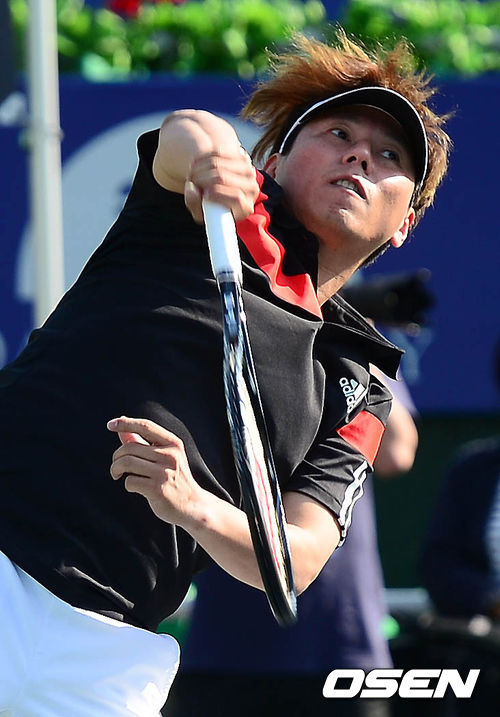 윤종신이 15일 오후 서울 방이동 올림픽공원 테니스 센터 코트에서 열린 마리아 키릴렌코와의 프랜즈 매치 행사에서 서브를 넣고 있다.