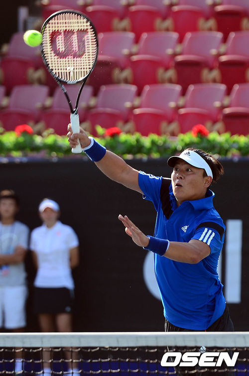 이재훈이 15일 오후 서울 방이동 올림픽공원 테니스 센터 코트에서 열린 마리아 키릴렌코와의 프랜즈 매치 행사에서 경기를 펼치고 있다.