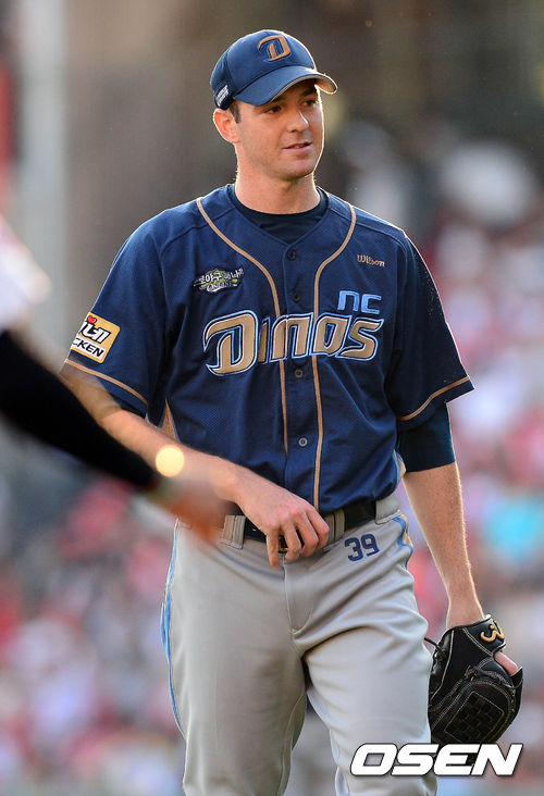 15일 오후 서울 잠실구장에서 열린 '2013 한국야쿠르트 세븐 프로야구' LG 트윈스와 NC 다이노스의 경기 3회말 2사 3루 정성훈을 플라이볼로 처리한 찰리가 덕아웃으로 향하고 있다.