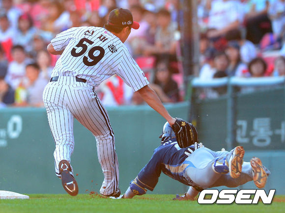 15일 오후 서울 잠실구장에서 열린 '2013 한국야쿠르트 세븐 프로야구' LG 트윈스와 NC 다이노스의 경기 4회초 1사 이상호의 내야땅볼 상황, 투수 신재웅이 이상호를 태그아웃 시키고 있다.