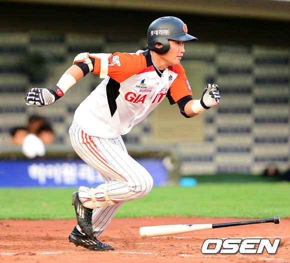 15일 오후 부산 사직야구장에서 열린 롯데 자이언츠와 두산 베어스의 경기, 4회말 무사에서 롯데 조홍석이 중전 안타를 치고 그라운드를 달리고 있다.