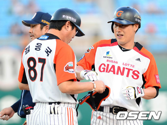 15일 오후 부산 사직야구장에서 열린 롯데 자이언츠와 두산 베어스의 경기, 5회말 무사에서 롯데 장성호가 좌전 안타를 치고 김응국 코치와 이야기를 나누고 있다.