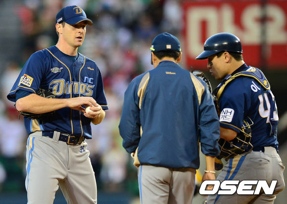 15일 오후 서울 잠실구장에서 열린 '2013 한국야쿠르트 세븐 프로야구' LG 트윈스와 NC 다이노스의 경기 6회말 2사 2루 이병규 타석, 찰리가 이태원과 이야기를 나누고 있다.