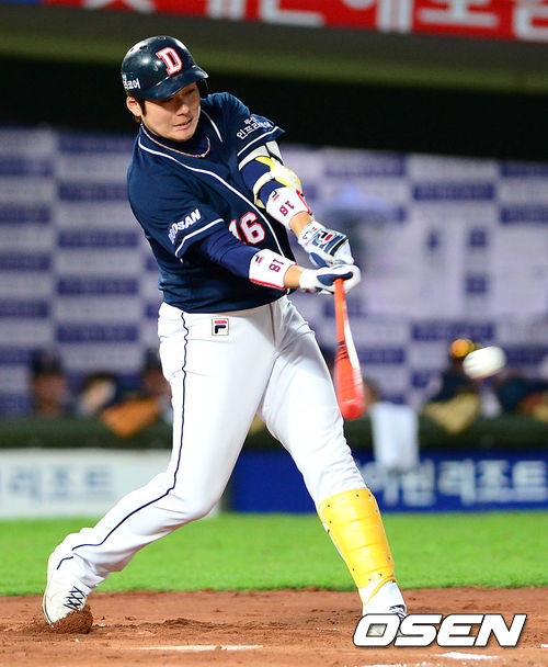 15일 오후 부산 사직야구장에서 열린 롯데 자이언츠와 두산 베어스의 경기, 6회초 2사 2,3루에서 두산 이원석이 중전 2타점 적시타를 치고 있다.