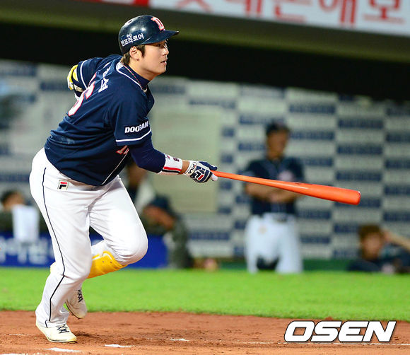 15일 오후 부산 사직야구장에서 열린 롯데 자이언츠와 두산 베어스의 경기, 6회초 2사 2,3루에서 두산 이원석이 중전 2타점 적시타를 치고 있다.