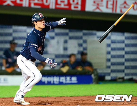 15일 오후 부산 사직야구장에서 열린 롯데 자이언츠와 두산 베어스의 경기, 7회초 1사 2,3루에서 두산 민병헌이 우전 2타점 적시타를 치고 있다.