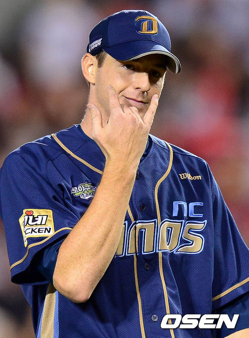 15일 오후 서울 잠실구장에서 열린 '2013 한국야쿠르트 세븐 프로야구' LG 트윈스와 NC 다이노스의 경기 7회말 2사 1,2루 오지환을 삼진으로 처리한 찰리가 덕아웃으로 향하며 미소를 짓고 있다.