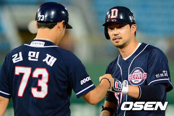 15일 오후 부산 사직야구장에서 열린 롯데 자이언츠와 두산 베어스의 경기, 7회초 2사 2루에서 두산 오재원이 중전 적시타를 치고 김민재 코치와 하이파이브를 하고 있다.