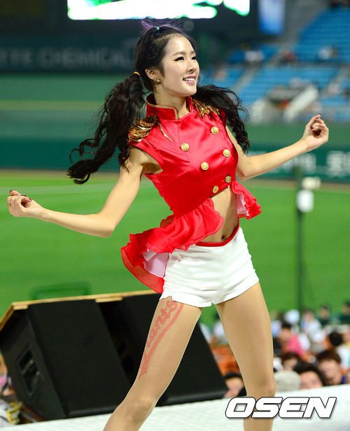 15일 오후 부산 사직야구장에서 열린 롯데 자이언츠와 두산 베어스의 경기, 롯데 치어리더 박기량이 화려한 공연을 펼치고 있다.