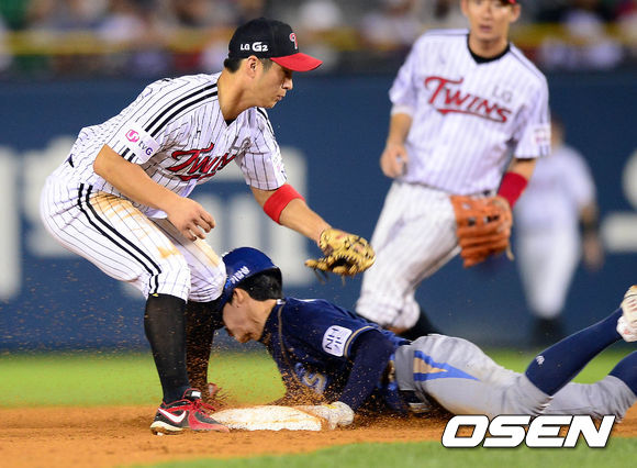 15일 오후 서울 잠실구장에서 열린 '2013 한국야쿠르트 세븐 프로야구' LG 트윈스와 NC 다이노스의 경기 9회초 1사 1루 대타 박정준의 타석 1루 대주자 박민우가 도루에 성공하고 있다.