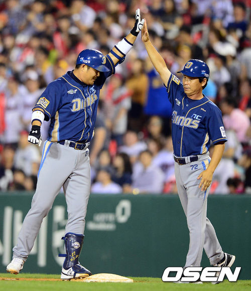 15일 오후 서울 잠실구장에서 열린 '2013 한국야쿠르트 세븐 프로야구' LG 트윈스와 NC 다이노스의 경기 9회초 2사 1,2루 이호준이 2타점 적시타를 치고 1루코치와 하이파이브를 하고 있다.