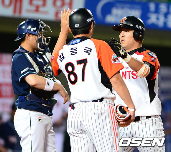 15일 오후 부산 사직야구장에서 열린 롯데 자이언츠와 두산 베어스의 경기, 9회말 1사 1,3루에서 롯데 강민호가 동점 중월 스리런 홈런을 치고 홈에서 김응국 코치와 하이파이브를 하고 있다.