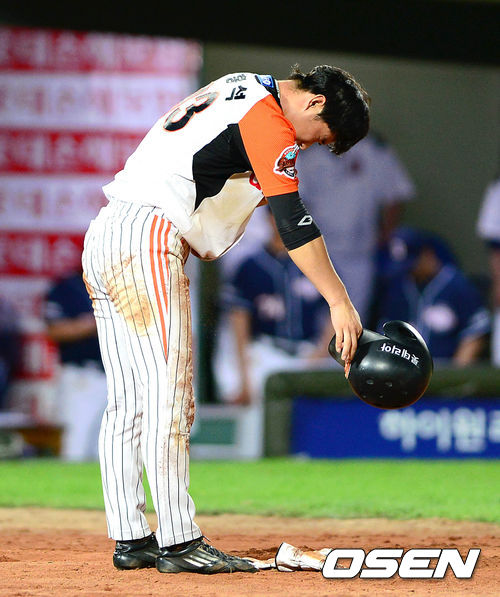 15일 오후 부산 사직야구장에서 열린 롯데 자이언츠와 두산 베어스의 경기, 9회말 2사 2루에서 롯데 조성환의 내야안타 때 홈으로 쇄도한 2루주자 조홍석이 아웃되고 있다.