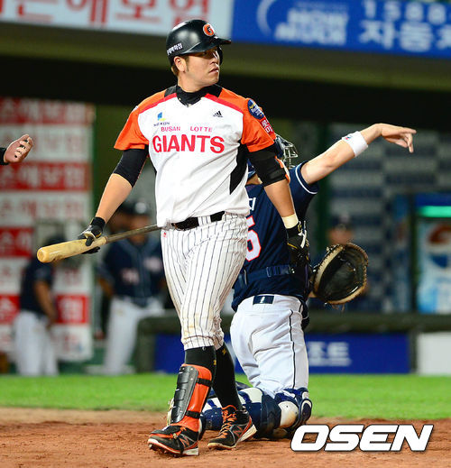 15일 오후 부산 사직야구장에서 열린 롯데 자이언츠와 두산 베어스의 경기, 11회말 1사에서 롯데 강민호가 삼진으로 물러나고 있다.