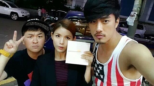 공개된 사진 속에는 베이지가 허각에게 받은 청첩장을 들고 포즈를 취하고 있다. 허각은 베이지 옆에서 브이자를 그리며 친분을 과시하고 있다.