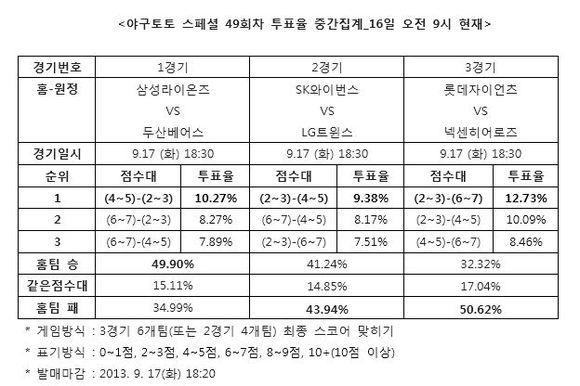 국민체육진흥공단(www.kspo.or.kr)이 발행하는 체육진흥투표권 수탁사업자인 스포츠토토의 공식 온라인 발매 사이트 베트맨(www.betman.co.kr)이 17일(화)에 열리는 한국프로야구(KBO) 3경기를 대상으로 한 야구토토 스페셜 49회차 투표율을 중간 집계한 결과, 참가자의 50.62%는 롯데-넥센(3경기)전에서 넥센의 승리를 예상했다.