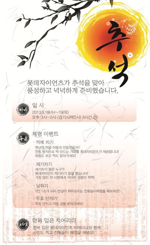 먼저, 인절미와 송편을 직접 만드는 떡메치기 체험과 무료시식행사를 연다. 또한, 누구나 현장에서 참여할 수 있는 제기차기왕 선발대회가 있고 우승자에게는 롯데호텔 라세느 식사권, 준우승은 TGIF 상품권이 경품으로 주어진다.