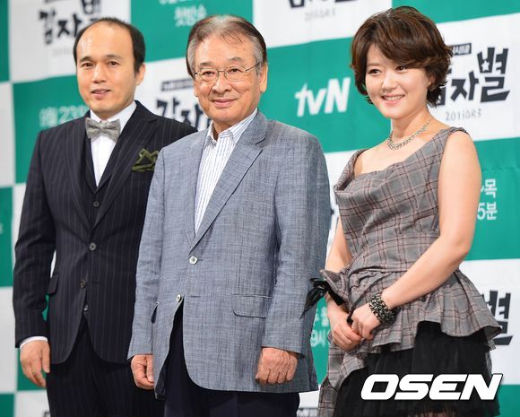 배우 김광규, 이순재, 오영실이 16일 오후 서울 논현동 임피리얼 팰리스에서 열린 tvN 새 일일 시트콤 '감자별 2013QR3' 제작발표회에 참석해 포토타임을 갖고 있다.