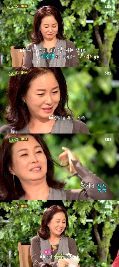 김미숙은 16일 방송된 SBS 토크쇼 ‘힐링캠프, 기쁘지 아니한가’에서 아들과 딸의 편지를 읽은 후 눈물을 글썽거렸다.