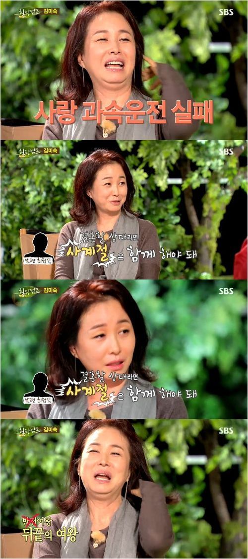 김미숙은 ‘힐링캠프’에서 “남편과 지방을 다녀오던 길이었는데 눈이 너무 와서 그런가 너무 천천히 운전을 하더라. 집에 가는 길이 너무 힘들고 싫어서, 내가 먼저 결혼하자고 했다”고 특유의 우아한 목소리로 말했다.