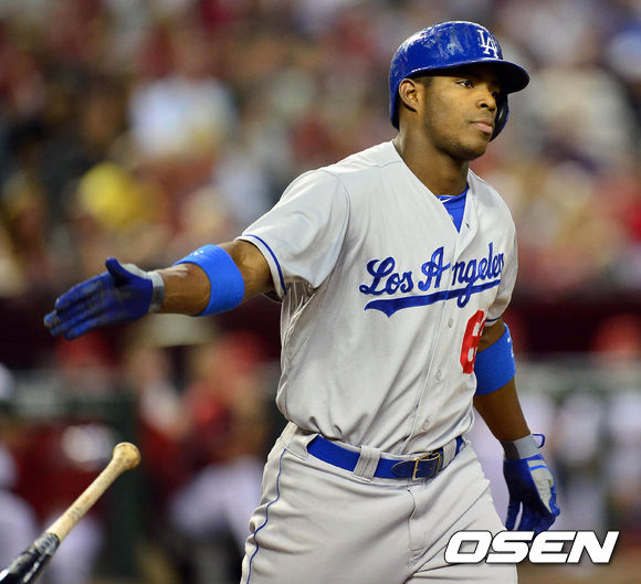 17일 (이하 한국시간) 미국 애리조나 피닉스 체이스필드에서 열린 2013 메이저리그 애리조나 다아아몬드백스와 LA 다저스 경기, 1회초 2사 2루 푸이그가 볼넷으로 출루하고 있다.