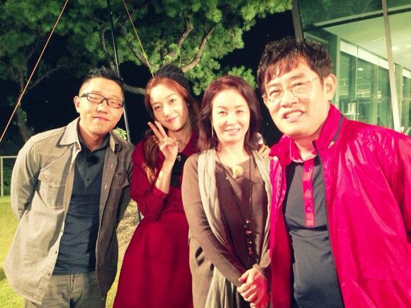 '힐링캠프' MC들과 기념사진을 찍은 김미숙. 가운데 성유리와 김미숙의 포즈가 특히 다정하다. /SBS 제공.