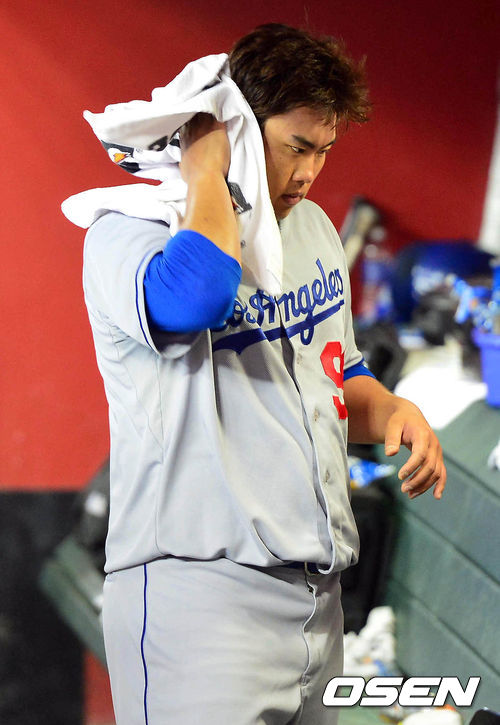 17일 (이하 한국시간) 미국 애리조나 피닉스 체이스필드에서 열린 2013 메이저리그 애리조나 다아아몬드백스와 LA 다저스 경기, 3회초 선두타자로 나선 류현진이 삼진을 당한 후 덕아웃에서 땀을 닦고 있다.