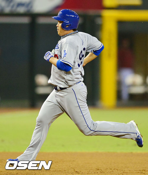 17일 (이하 한국시간) 미국 애리조나 피닉스 체이스필드에서 열린 2013 메이저리그 애리조나 다아아몬드백스와 LA 다저스 경기, 6회초 무사 주자 1루 닉 푼토의 좌중간 2루타때 1루 주자 류현진이 3루로 향하고 있다.
