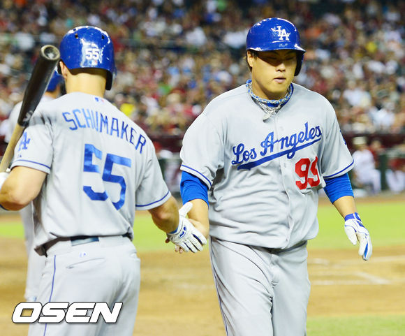 17일 (이하 한국시간) 미국 애리조나 피닉스 체이스필드에서 열린 2013 메이저리그 애리조나 다아아몬드백스와 LA 다저스 경기, 6회초 1사 주자 만루 다저스 푸이그가 타석에서 볼넷을 얻으며 밀어내기로 3루 주자 류현진이 홈을 밟은 후 슈마커와 하이파이브를 하고 있다.