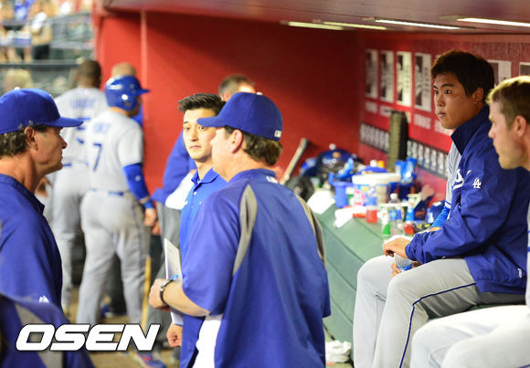 17일 (이하 한국시간) 미국 애리조나 피닉스 체이스필드에서 열린 2013 메이저리그 애리조나 다아아몬드백스와 LA 다저스 경기, 7회말을 마친 다저스 류현진이 매팅리 감독을 향해 덕아웃에서 고개를 끄덕이고 있다.