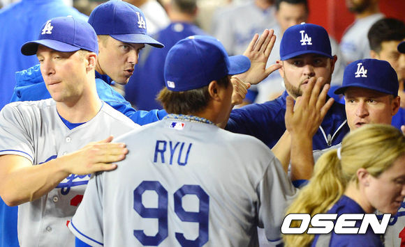 17일 (이하 한국시간) 미국 애리조나 피닉스 체이스필드에서 열린 2013 메이저리그 애리조나 다아아몬드백스와 LA 다저스 경기, 8회말을 마친 류현진이 덕아웃에서 동료들의 격려를 받고 있다.
