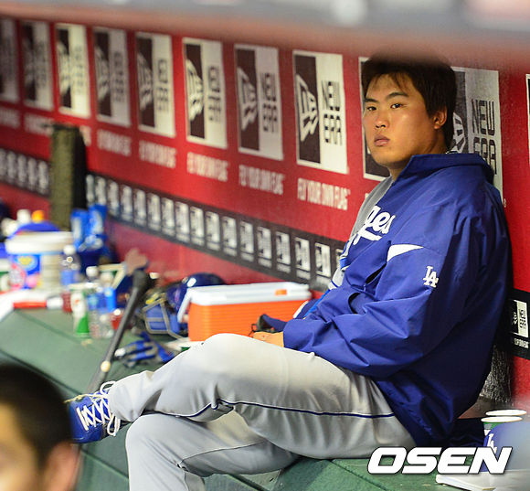 9회초 2사 주자 2,3루 다저스 류현진 대타로 멧 캠프가 타석에 나서는 모습을 류현진이 지켜보고 있다. / rumi@osen.co.kr