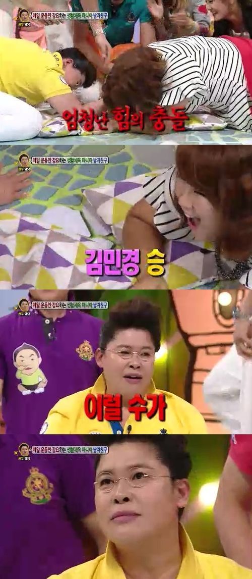 이영자는 16일 방송된 KBS 2TV 예능 프로그램 '대국민 토크쇼 안녕하세요'에서 김민경과 팔씨름 대결을 펼쳤다.