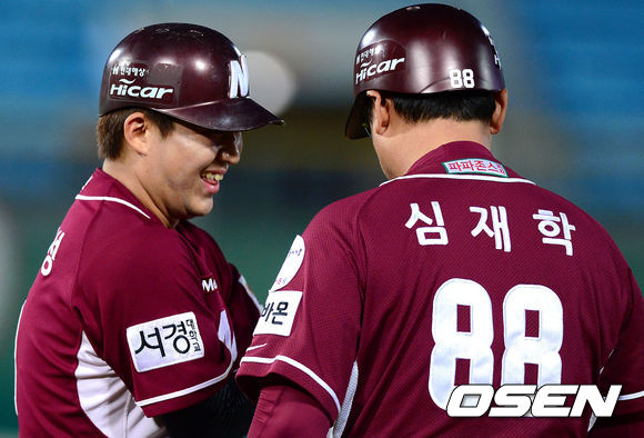 17일 오후 부산 사직구장에서 열린 '2013 한국야쿠르트 세븐 프로야구' 롯데 자이언츠와 넥센 히어로즈의 경기, 2회초 넥센 선두타자 김민성이 1루수와 우익수 사이에 떨어지는 행운의 안타를 날린후 미소 짓고 있다.