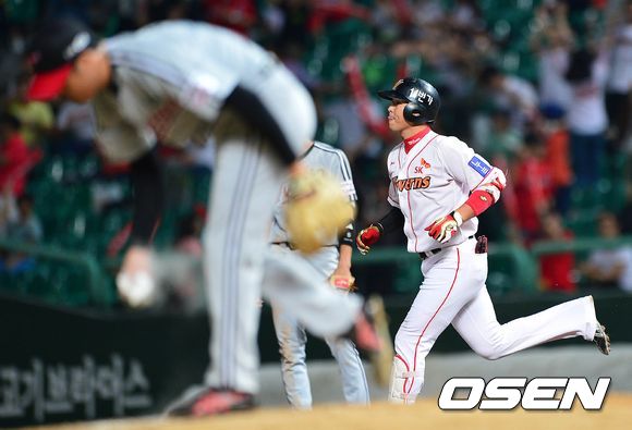 4회말 SK 공격 1사 주자없는 상황 3번타자 최정이 좌월 솔로포를 날리고 그라운드를 돌고 있다.