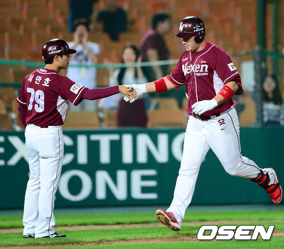 17일 오후 부산 사직구장에서 열린 '2013 한국야쿠르트 세븐 프로야구' 롯데 자이언츠와 넥센 히어로즈의 경기, 3회초 무사 1,2루 넥센 박병호가 3점 홈런을 날리고 최만호 코치와 하이파이브를 하고 있다. 이날 홈런으로 박병호는 2년 연속 시즌 30호 홈런을 달성했다. 홈런 단독 1위.