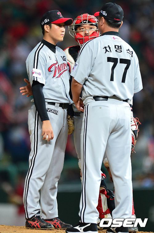 5회말 SK 공격 1사 1, 2루 상황 마운드에 오른 차명석 코치와 LG 선발 신정락이 대화를 나누고 있다.